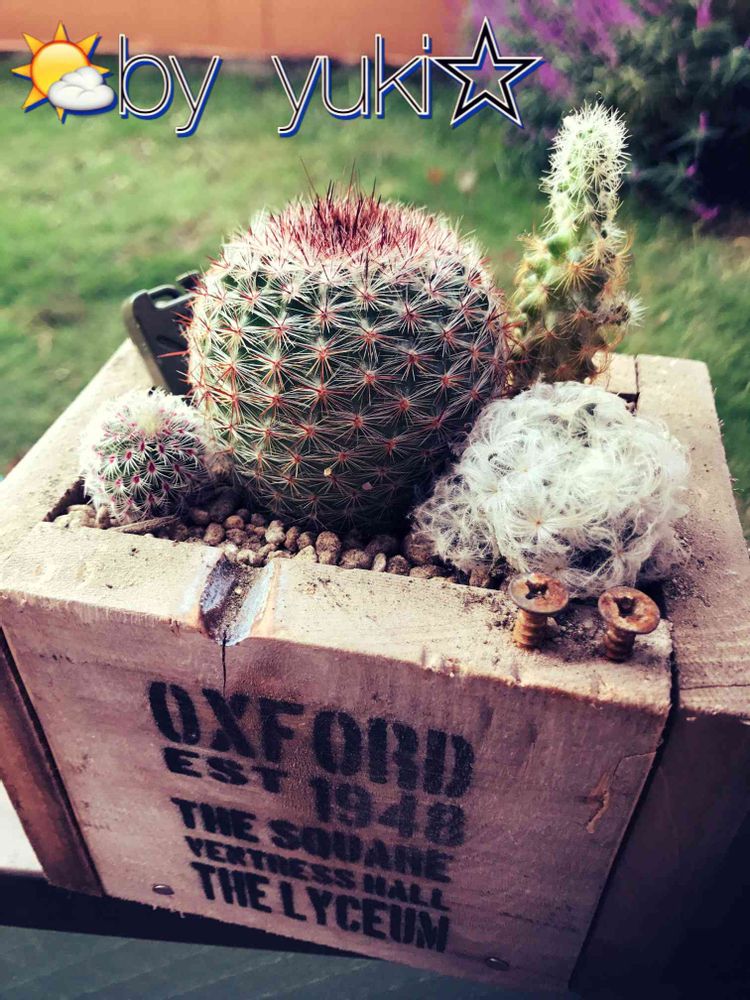 ikuraさん木箱に悩んだ結果、サボちゃんで(๑˃͈꒵˂͈๑) 今まで家の中でひょろひょろになってた子と一緒に😚