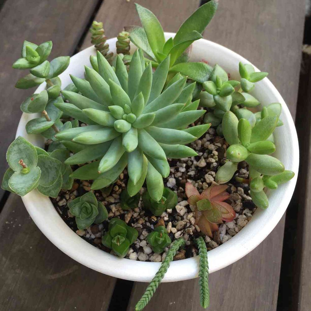 数珠星と若緑の抜き苗をいただいたので、ツンツン寄せ植えに挿してみました(◍•ᴗ•◍)