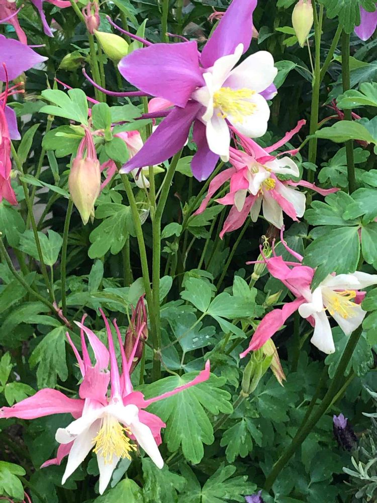 ピンクと紫の顎のオダマキが咲いている。