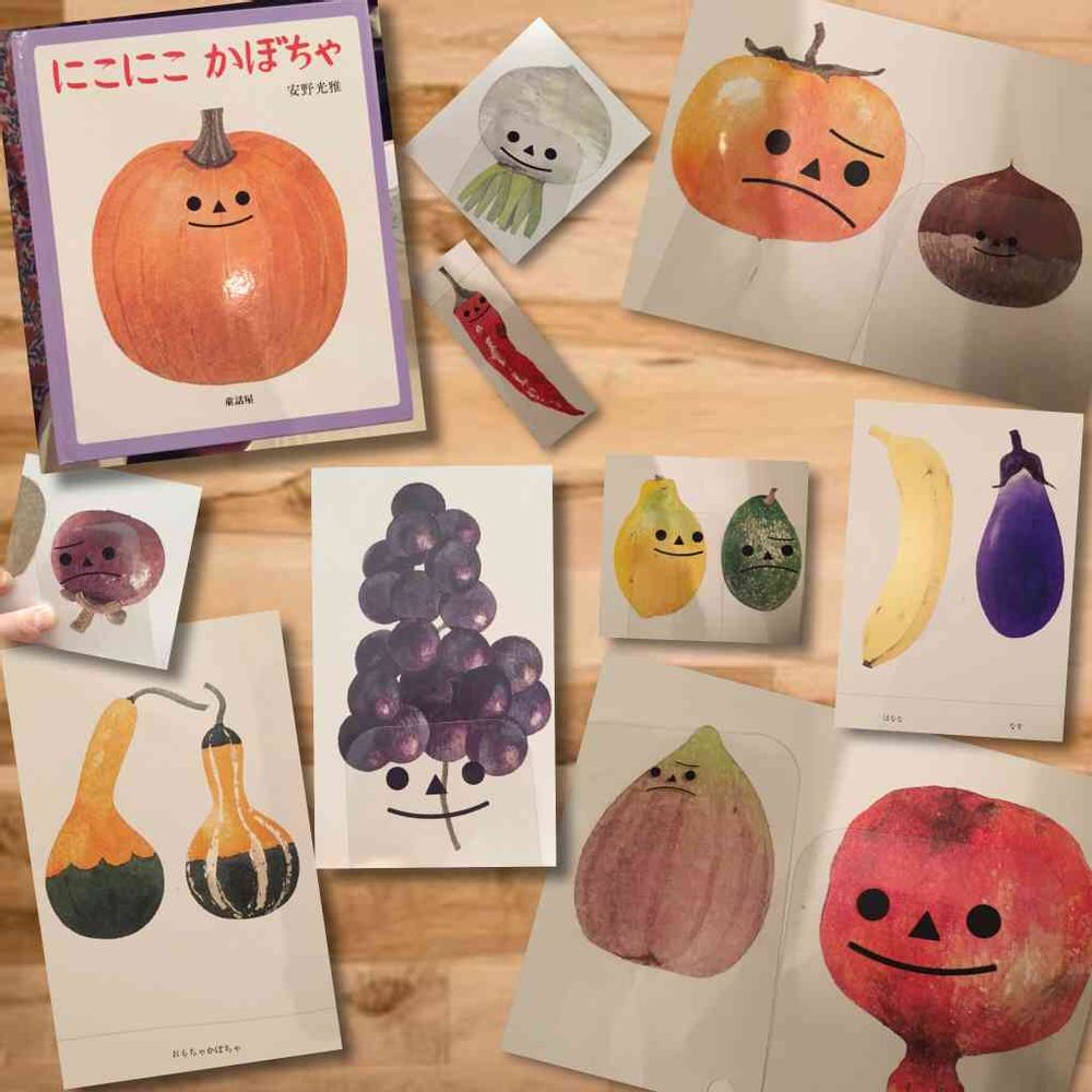 困ったチャン、にこにこさん大小が描かれた透明のシオリが付属についています。野菜に合わせる位置により様々な表情が作れ、子供が寝静まった後もしばらくこの絵本に笑い癒され十数年…。