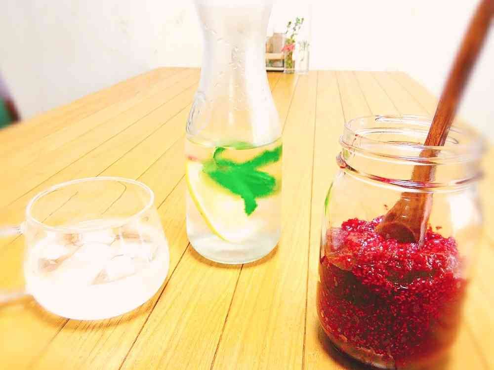 お水にミントの葉とレモンを入れてとても爽やかテイストです(*´꒳`*)