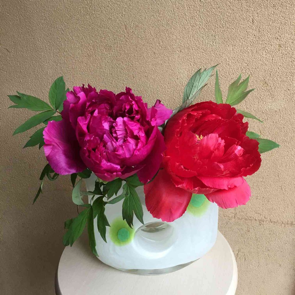 牡丹が咲き始めました。左のダークピンクは、今年初めて咲きました。