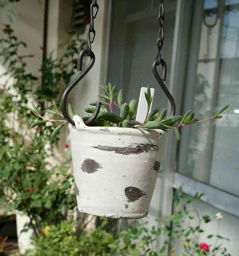 ルビーネックレスの鉢の麻ひもが細くて心許なかったので、100均のチェーンフックに付け替えてハンギング✨
