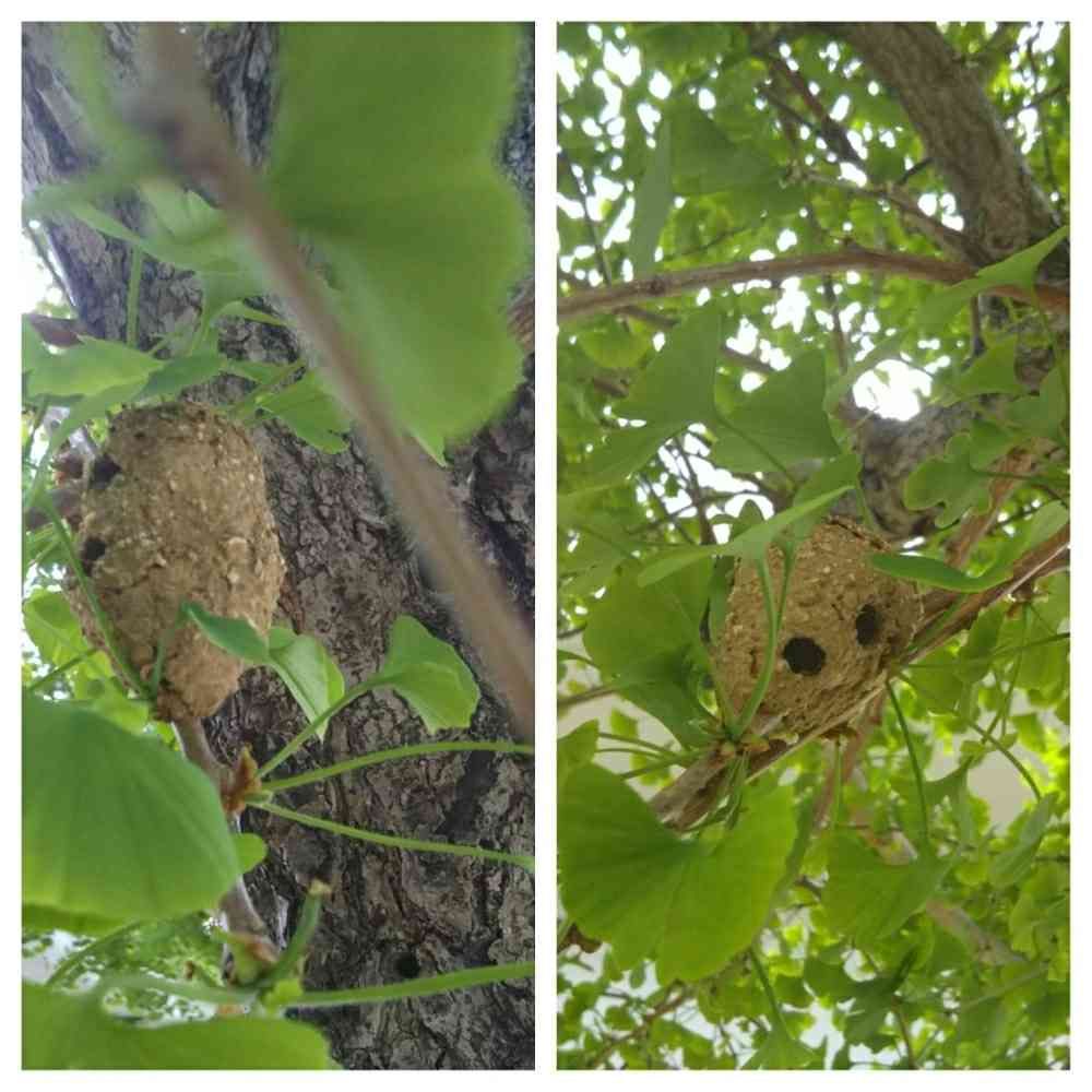こうなったら 雌花も見たい!ギンナンが落ちていた木を見に行ったら鼻👃が咲いていました⁉️5~6㎝の何かの巣🤔 左の写真下中央が