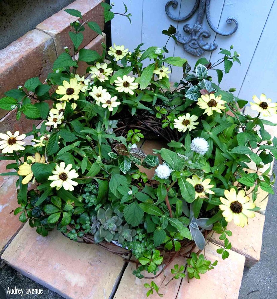 あけびの蔓を使ったリース型の寄せ植えにはジニアの足元に多肉さんを植えてあり、紅葉を始めました😊