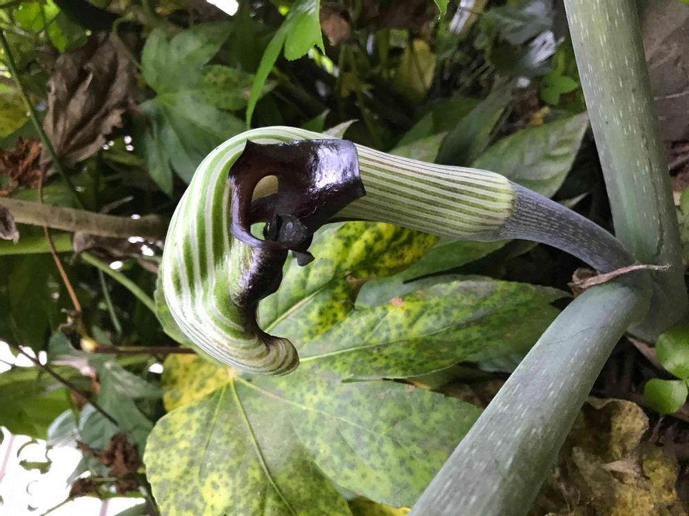 毎年この時期に咲いています。巨大な三つ葉のような形の葉を両側に広げ、その真ん中から花?らしきものがあります。
