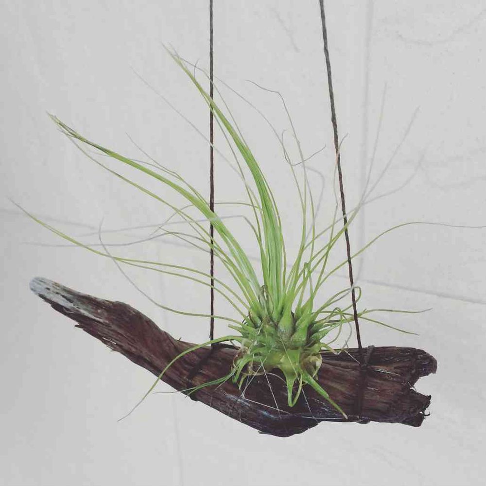 100均で買ったエアプランツを海岸で拾った流木に括りつけて吊るしてみた