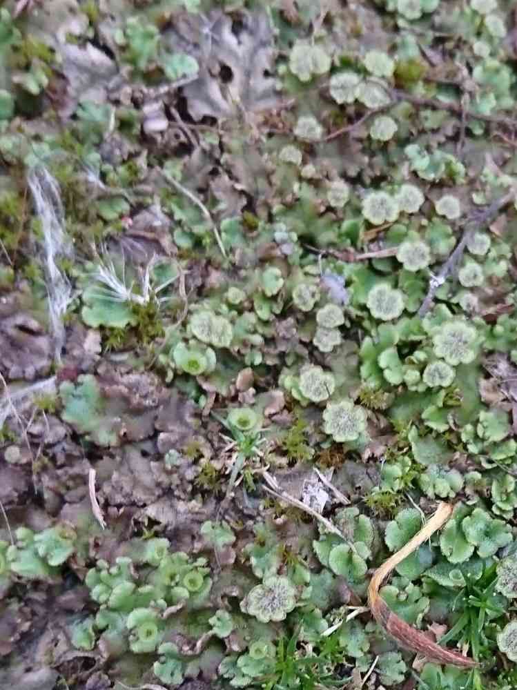 詳しく画像を見てみると、クローバーのように見えていたところが、ゼニゴケの雄株のようでした!