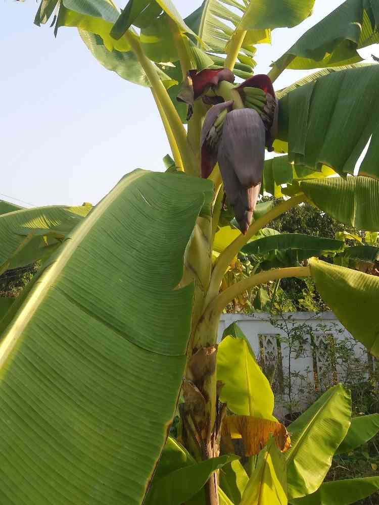 ナムワーバナナ、開花し始めました。画像では見られませんが、ミツバチが数匹、雌花に止まっています。