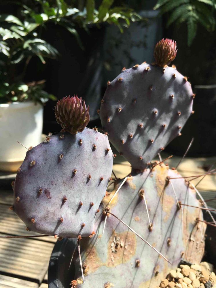 オプンチアアズレアの花?新芽?異様なトゲと紫色が冴え渡る。