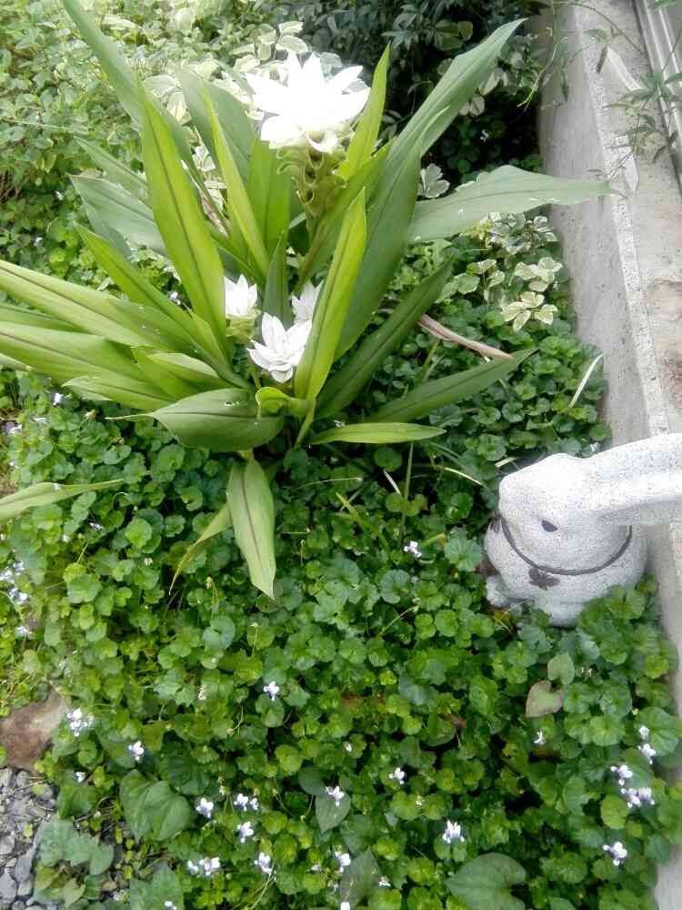 クルクマの白花です。とっても美しくずっと咲いています。切り花にしても大変長持ちします。和名は花ウコンとか。ピンクと緑もありますが私はこの白が一番好きです。うさぎさんは退職祝いに同僚からいただいたものです。