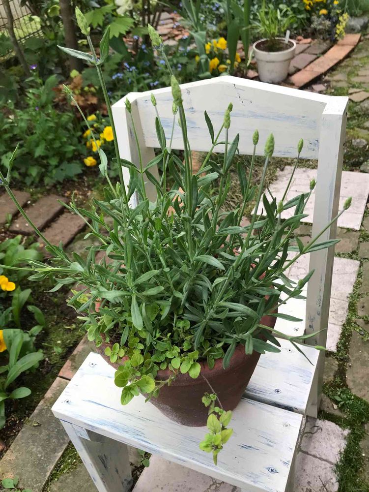 手頃な乗せるサイズの鉢がなかったので、まだ花の咲かないラベンダーを載せて見たけどやっぱり地味……。( ´∀`)ハハハ