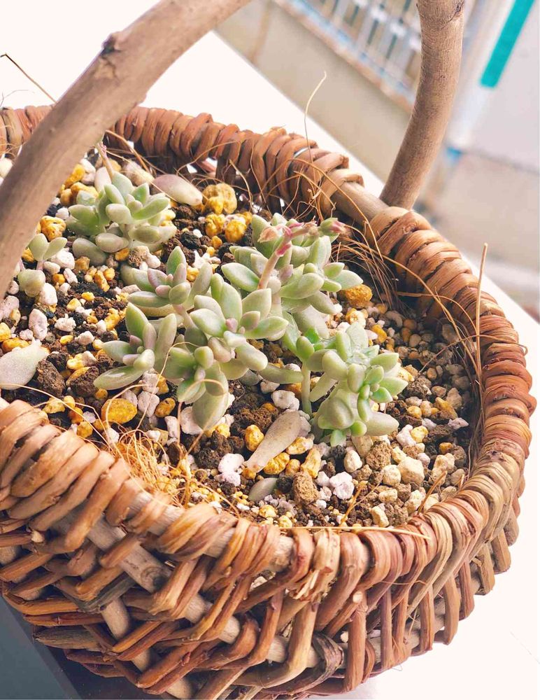 このカゴ、なぜか家にもある‼️多肉植えるには編目から土溢れるから どーしよう?って思ってたけどヤシのヒゲ?を敷けばいいのね〜😂←目から鱗