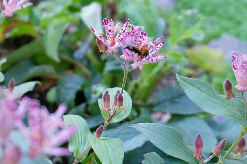 ホトトギスの写真を撮っていたらずんぐりむっくりのハチ?が来て、夢中で蜜を吸っていました♡