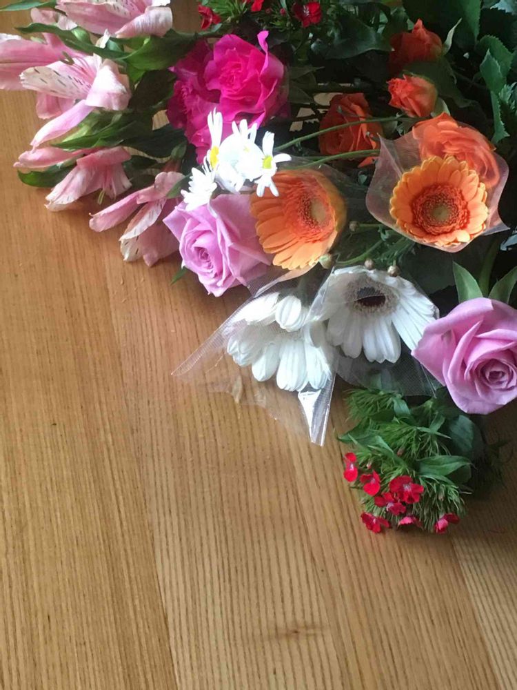 バラにガーベラに、アストロメリア・・なでしこ?もありますかね☘️水あげして、イキイキ中ですね🎵