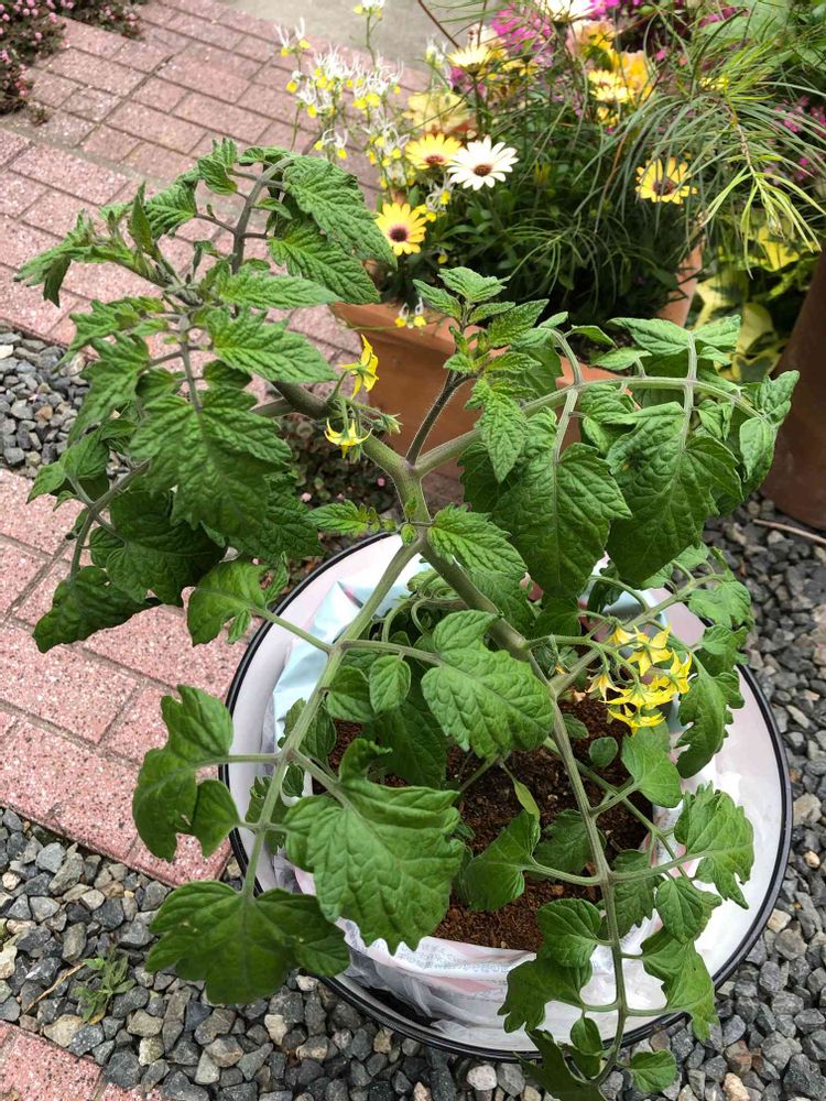 でもベランダで育ててまして、雨続きで虫もいないなぁ〜と思って畑へ定植してきました。トマトは一番花の受粉大事といいますから😅花の中に雄雌あるので、筆こちょこちょ🖌で受粉するとは思います👌