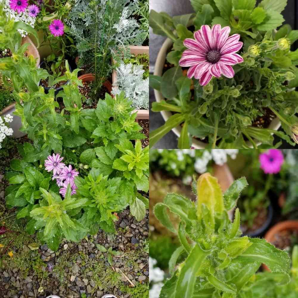 アスターが、大きくなり、真ん中のストライプのディモルホセカ隠れながら、小さく咲いてます。