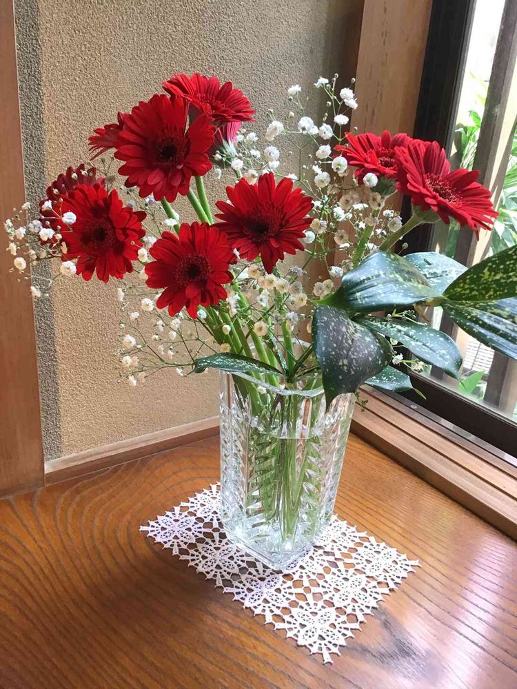 昨日、花屋さんで 小振りの 赤いガーベラ ( 10 本 ) と、白いかすみ草 少量 とのセットで 組んだ 花束💐を 398円と、なんと 安く、、売っているのを 見つけました。 それに 決めて、添えの葉っぱの 観葉植物 1本を 付け加えてもらい、500円ほど でした。