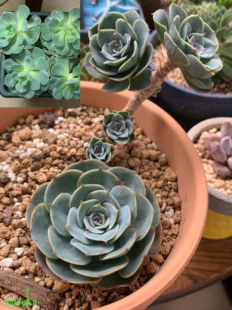先日徒長した4つの丼のうち3つは3頭1株になってたので残りの1頭を独立させました😃その時に思い切って付いてる子株を切り離したんですが良かったのかどうか😅 ただ親株が大き過ぎて日陰になって徒長しちゃうし思い切ってカットしました✂️今から親株から出て来る子はそのままにしようと思います😏🍀