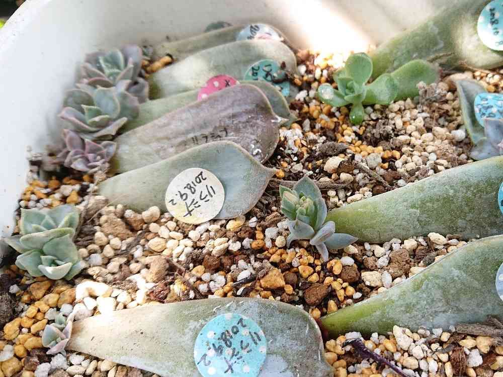 この子たちは葉っぱが元々大きいから並んでるけど他の所の葉挿しっ子はバラバラよ(ノ∀≦。)ノぷぷ-ッ