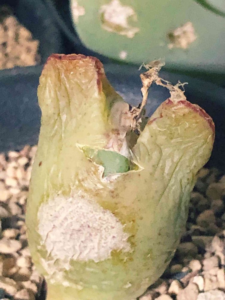 うちの子になった時からシワシワだった神風ちゃんがビリっと破れてなんか綺麗な緑が見える😳枯れないで脱皮だったの!?ドキドキ💓見守ってますよ😊🐶