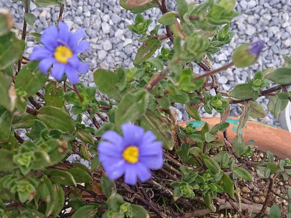 2年目のブルーデージーがようやく花をつけてくれました。去年と比べて花つきが悪いな・・・。挿し木して更新しなきゃダメなのかな・・・