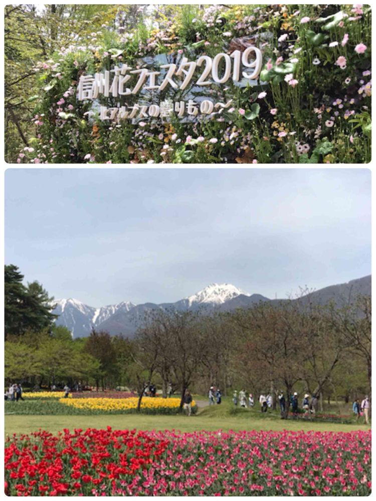 左から蝶ヶ岳・常念岳を背にチューリップ畑がとても綺麗でした🌷