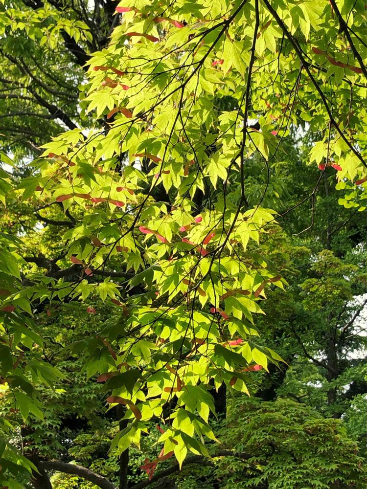 公園で見かけたモミジに薄い赤の花が付いています。春のグリーンのモミジもキレイです🍁