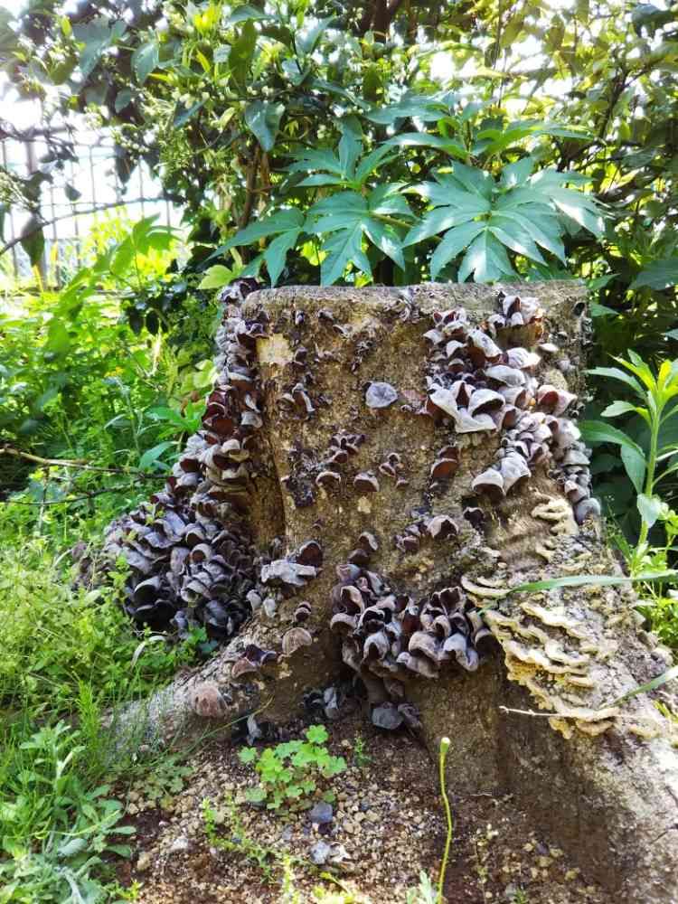 職場にある家庭菜園の切り株にびっしりと気持ち悪いくらい生えているキノコ。実はキクラゲです。昨年の秋から生えはじめて今ではびっしり!日本で流通している生クラゲの殆どかこの仲間だとか。
