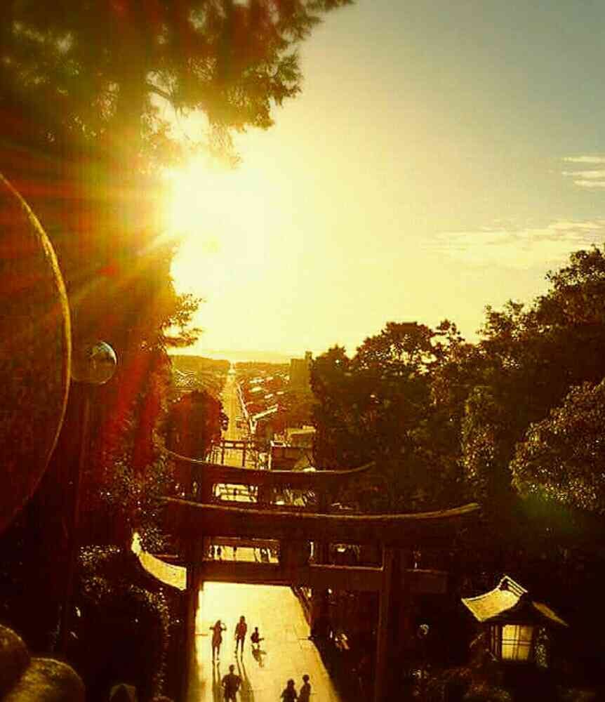 海に落ちていく夕日が鳥居や参道の先に真っ直ぐに沈む光の道✴