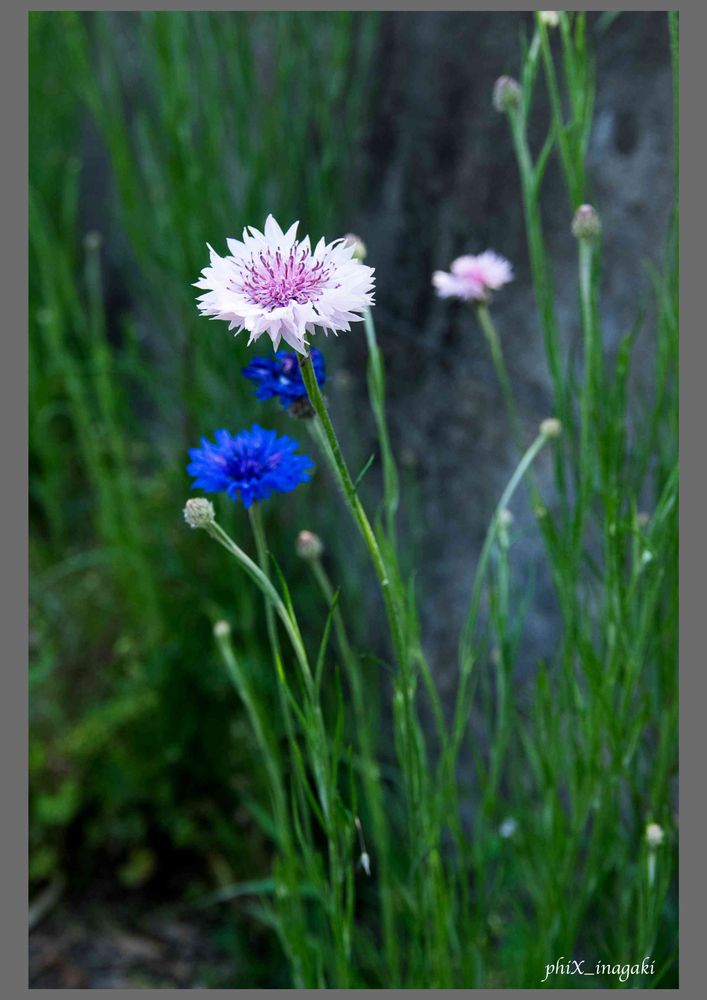 セントーレアの青い花と白い花が咲いていましたが、この白い花は花の中央がほんのり紫に染まっていました。20190503津市安濃町近郊にて。