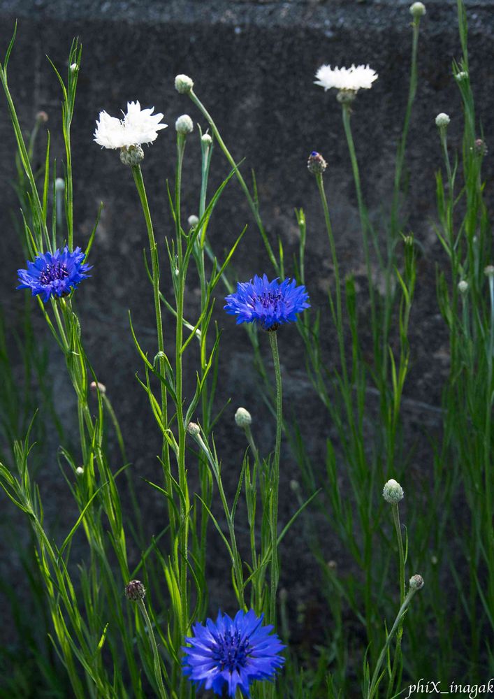 セントーレアの花の白と青が両方画面に入るように撮りました。ヤグルマギクの仲間、と言うことで、そう言われるとなるほどと思いました。20190503撮影。
