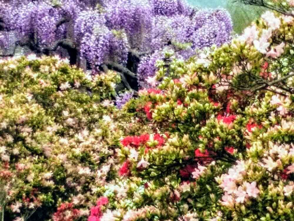 色とりどりの躑躅の向こうに艶やかな藤の花