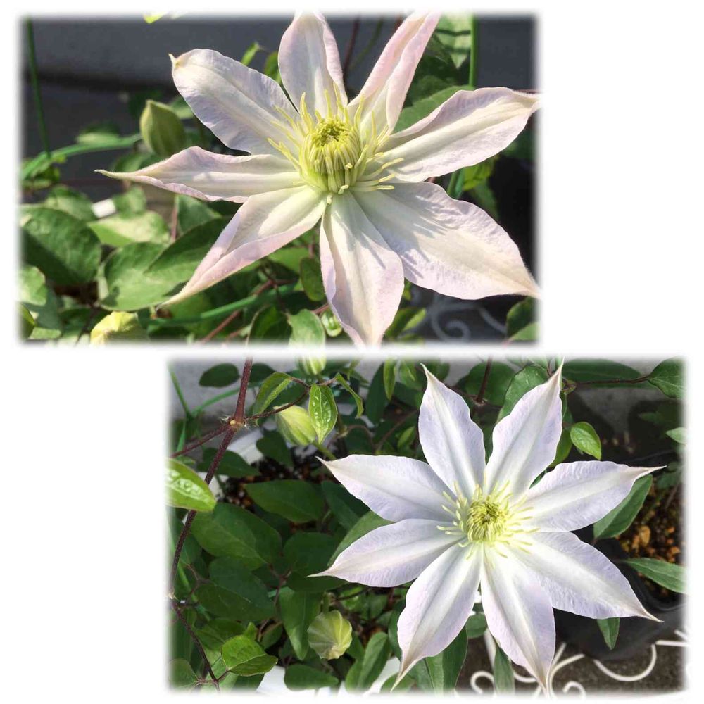 クレマチスの桜姫。昨日咲いたばかりの時は薄いピンク色に見えた花びらも、今朝は真っ白に見えるほどきれいに開いていました♫