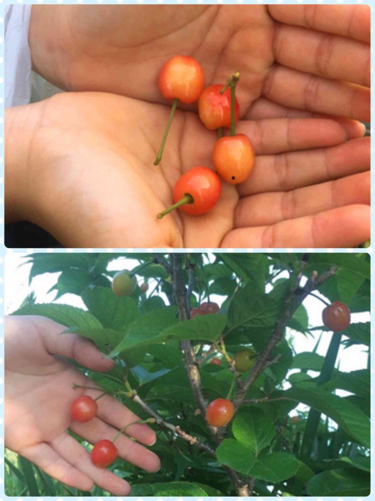 今の時期のさくらんぼはとぉ~ってもお高いから、収穫してツヤツヤの新鮮な🍒🍒を食べられるなんておチビちゃん達は幸せだな〜(笑)(´♡v♡)/んぴッ
