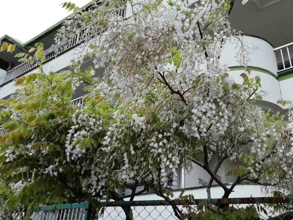 お出かけ先で見つけた白色藤。建物と塀の間で一生懸命大きくなってる💕