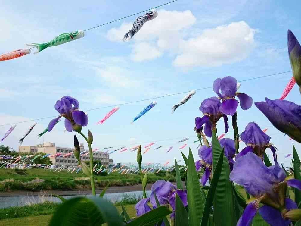 こどもの日らしく、菖蒲と、青空に泳ぐ鯉のぼり🎏