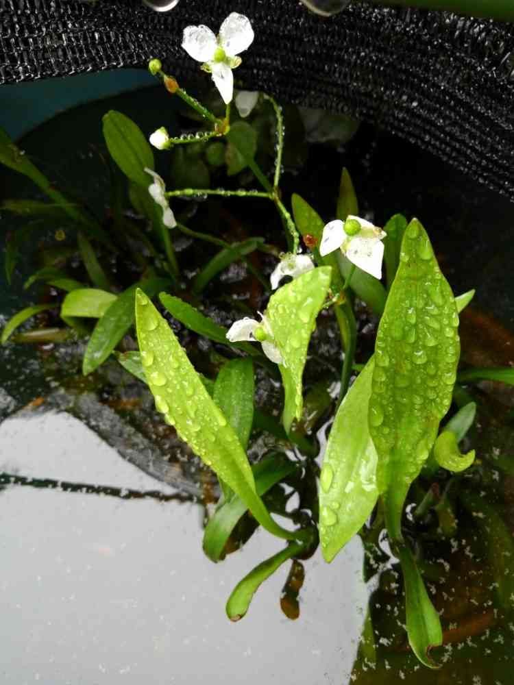 雨に濡れても綺麗に咲いています。メダカも少し見えますか?植え替えて元気になりました。💚