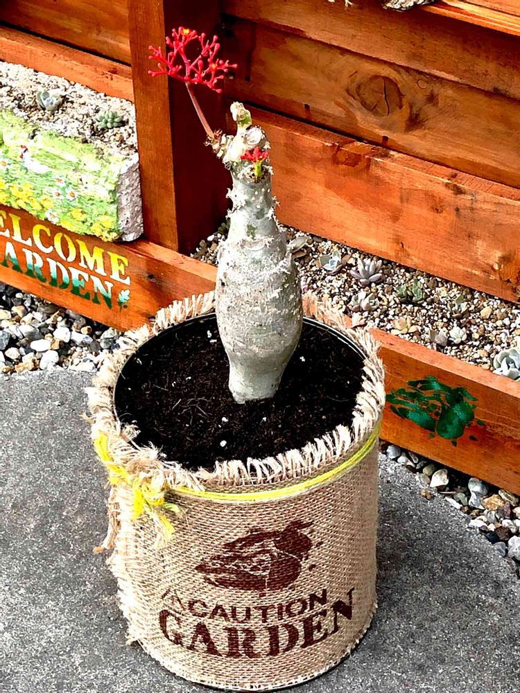 そこで連れ帰りました「サンゴアブラキリ」🌴 さっそく大きい鉢?リメ缶に植え替えました👍 そして今朝 更に花が3つ程咲いてました😆✨ 育てぇぇ😆