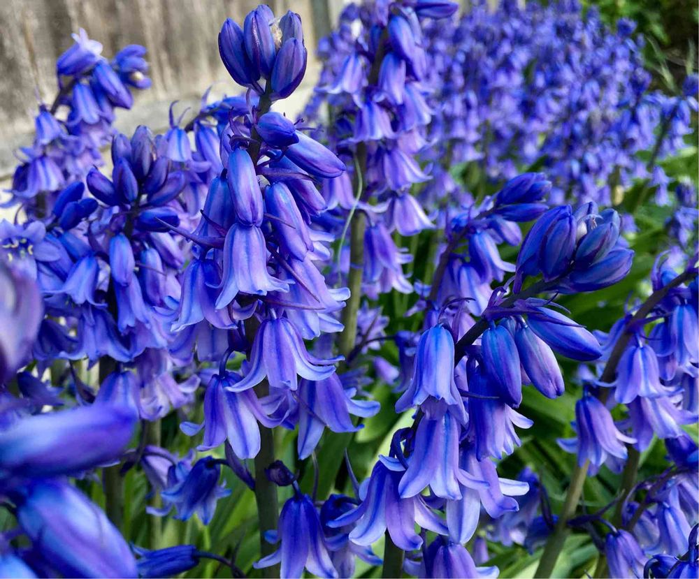 ヒヤシンスが庭に沿って満開。スパニッシュブルーベルかな、多分。