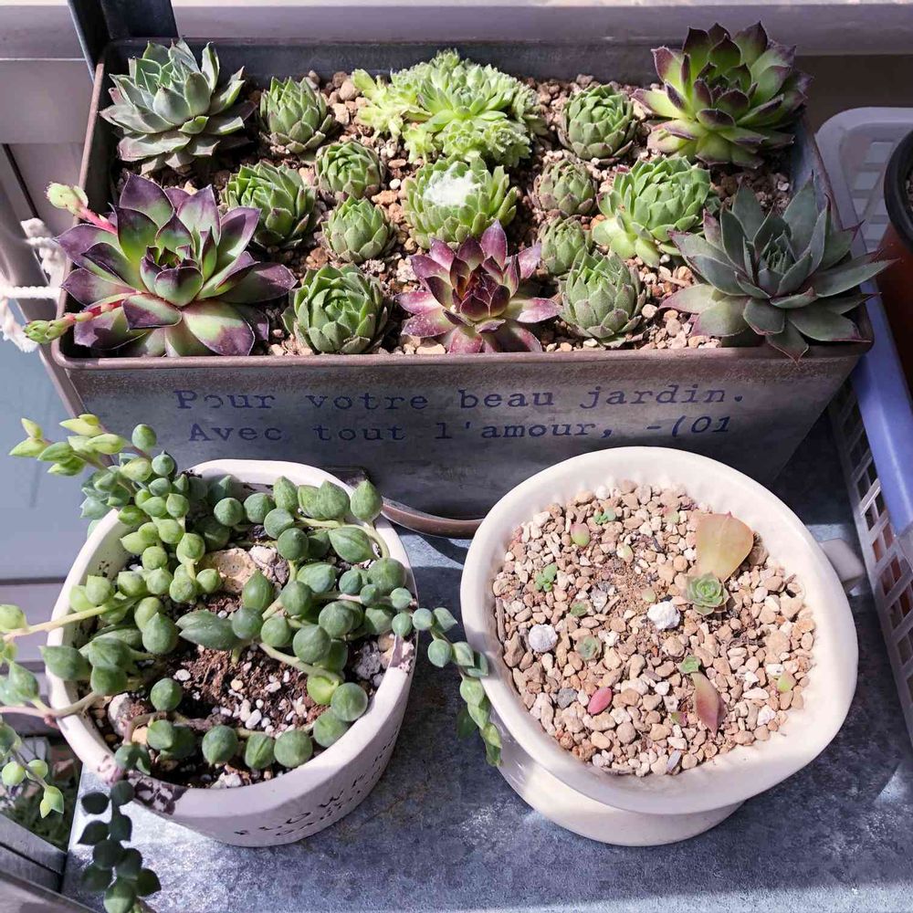 先日、仙台に行った時にガーデンガーデンてお店で見つけたブリキ鉢にグリーンデイズさんのセンペルビウムたちを並べてみました。なかなか皆さんみたいに素敵に寄せ植え出来ないけど、これからもりもり成長する事を期待(*´꒳`*)