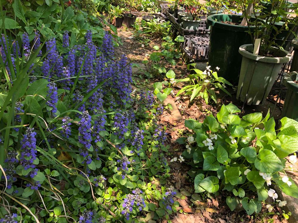 シェードガーデンでアジュガ バーガンディグローと原種スミレの