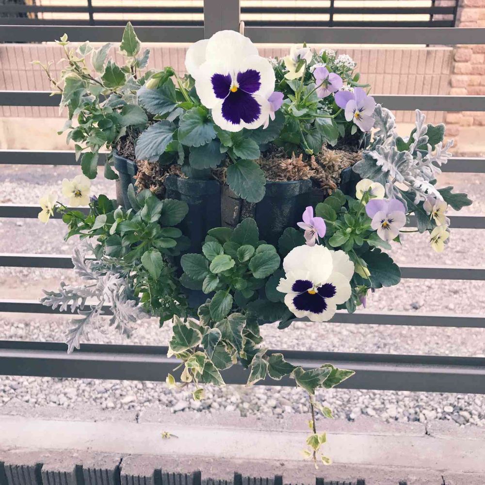 前回の写真の4日後。パンジーが正面を向いて、ビオラも少し咲きました。アリッサムを右上に追加…𓀤