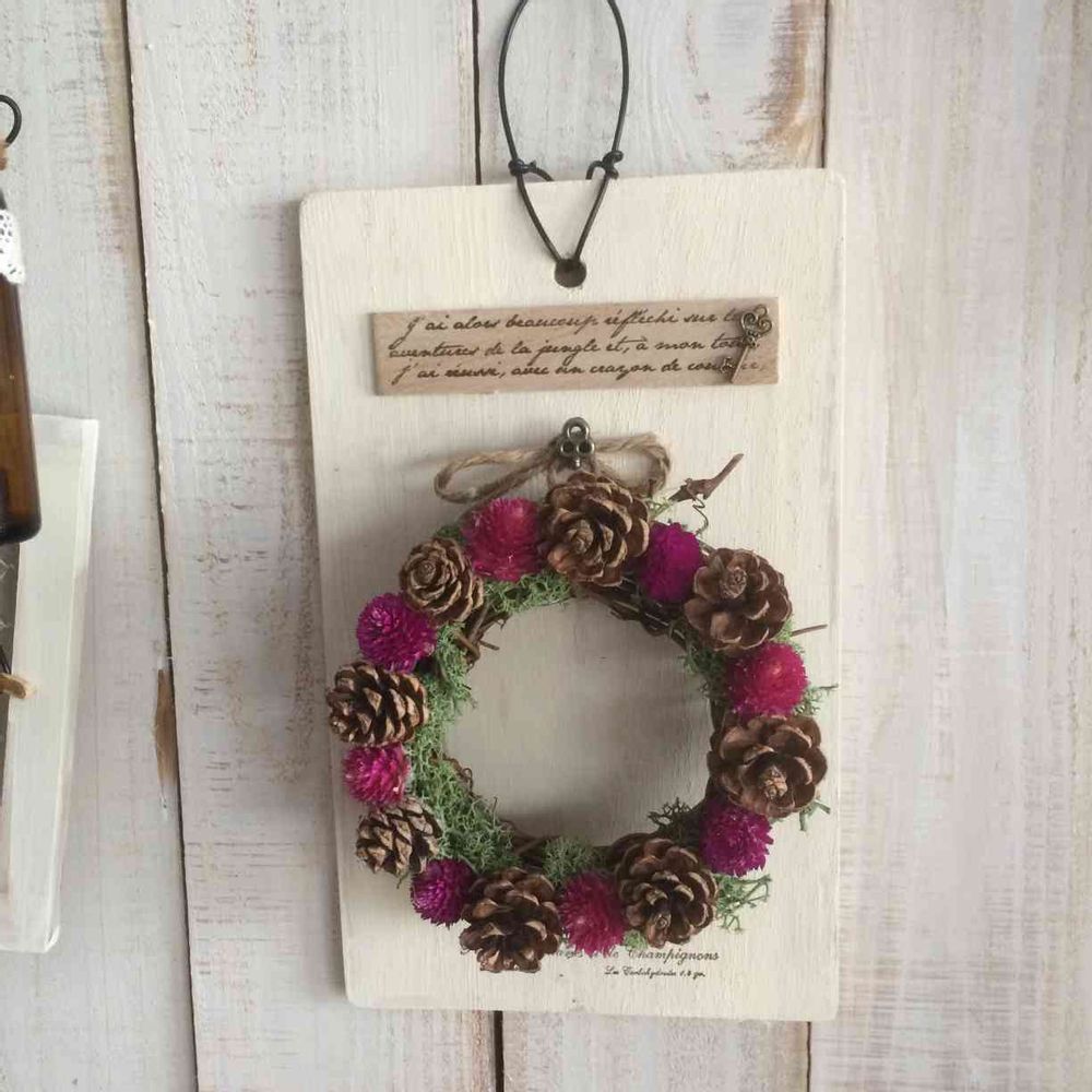 小さなミニリース作ったよ♡(ؔᵒ̶̷ᵕؔᵒ̷̶)千日紅のドライフラワーと、息子が拾って来た小さな松ぼっくりで( ૢ⁼̴̤̆ ꇴ ⁼̴̤̆ ૢ)~ෆ