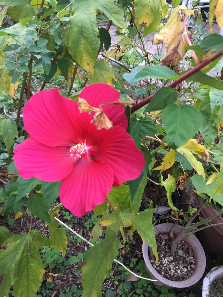 タイタンビカスの赤花です。白に比べると花の直径は15センチ程度で、少し小さめです。