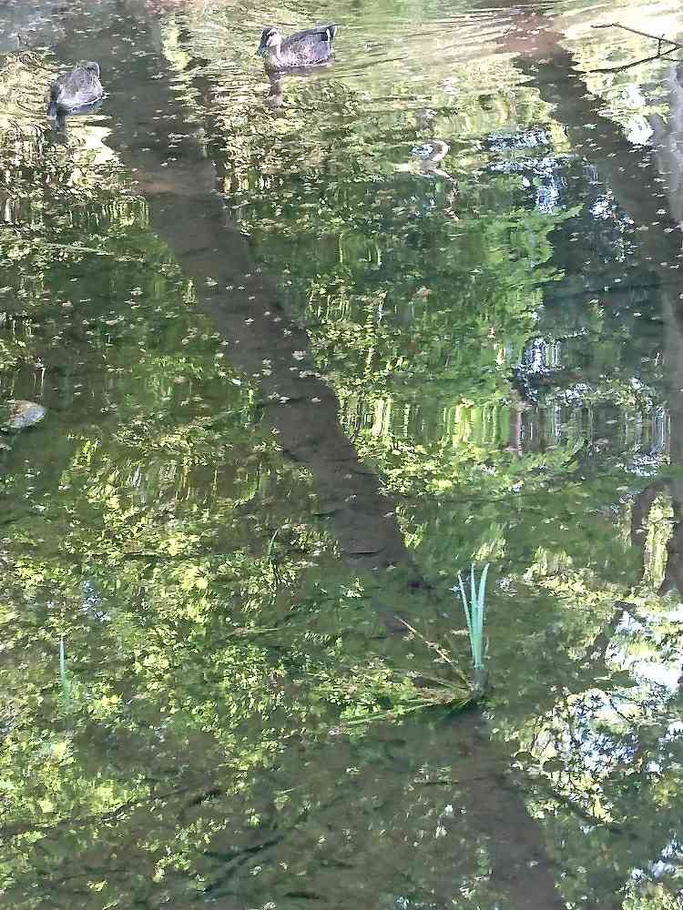 一番上に鴨が二羽仲良くお散歩していますので、これは、水面です。