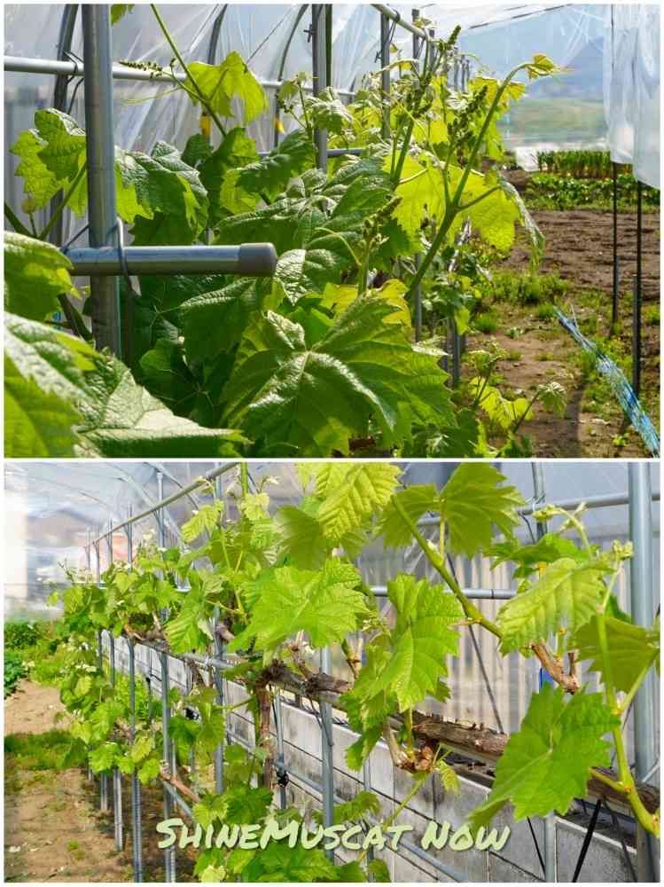 シャインマスカットも、新枝も伸び、葉が大きくなり、花芽が膨らんで来た。結実への着実な歩みが始まっている。🍃🌿🌼🍇😍😂