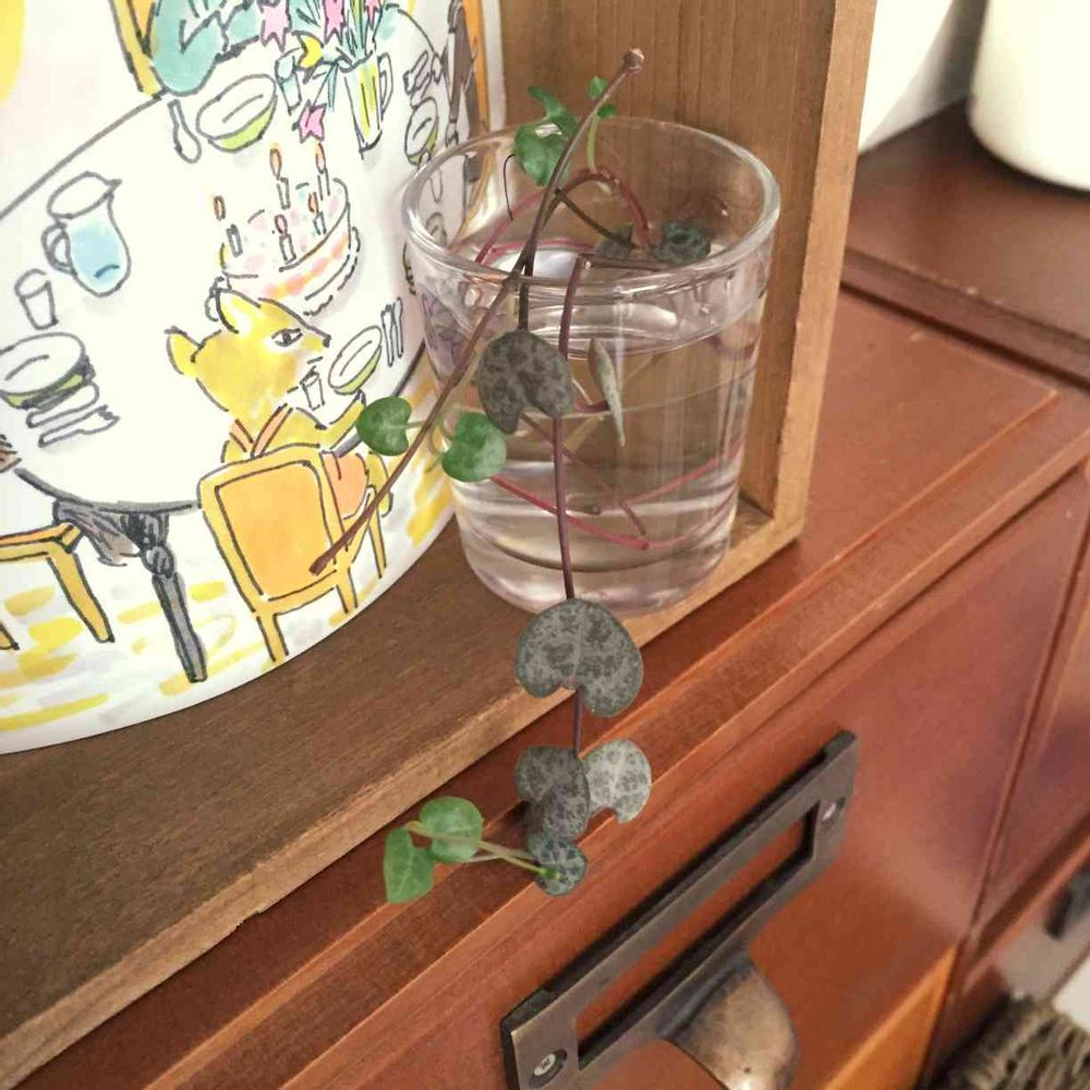 植え替えに失敗したのか?枯れ始めてきたハートカズラの元気な葉っぱを救出して水差し中。