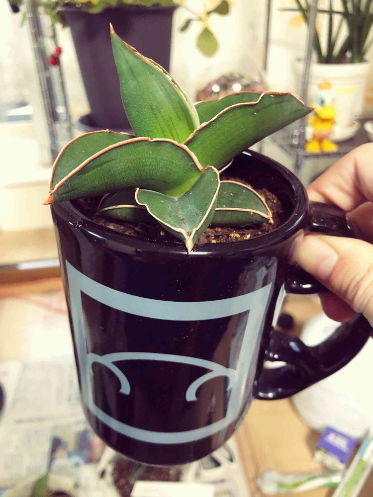 ヒビが入って使えなくなったマグカップにホールソーで穴を開けて鉢にし、サムライを植えました。でも窮屈そうで、すぐに根詰まりするかも…