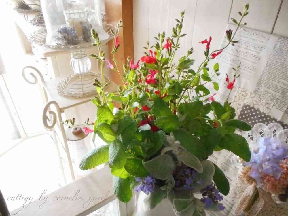 伸びすぎてしまったチェリーセージをカットして、他のハーブ🌿もプラスして飾ったらとってもいい香り♪゚゚+.・.。*゚♪゚゚+.・.。*゚♪゚゚+.・.。*゚♪